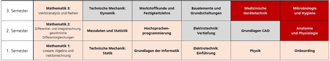 Im ersten Studienabschnitt werden drei Spezialisierungsmodulodule gelehrt, die einerseits die Basis für die Anwendung und Entwicklung medizinischer Geräte darstellen und hinreichende Kenntnisse in der medizinischenTerminologie vermitteln, um die Fachliteratur zu verstehen. Andererseits bauen sie medizintechnische Basiskompetenzen weiter aus und bereiten die Studierenden auf die weiterführenden Spezialisierungsmodule vor.